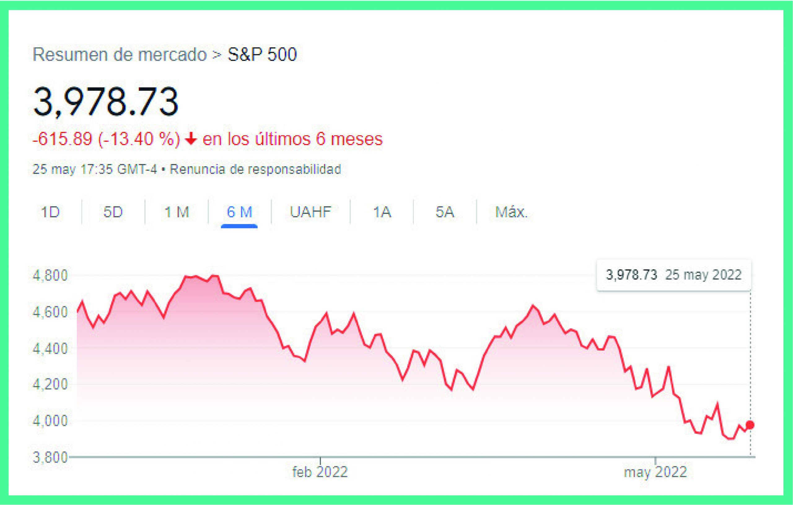 En esta época de crisis, el S&P 500, conocido como el índice más representativo de la situación real del mercado se mantiene a la baja con un - 13.10% en los últimos 6 meses.